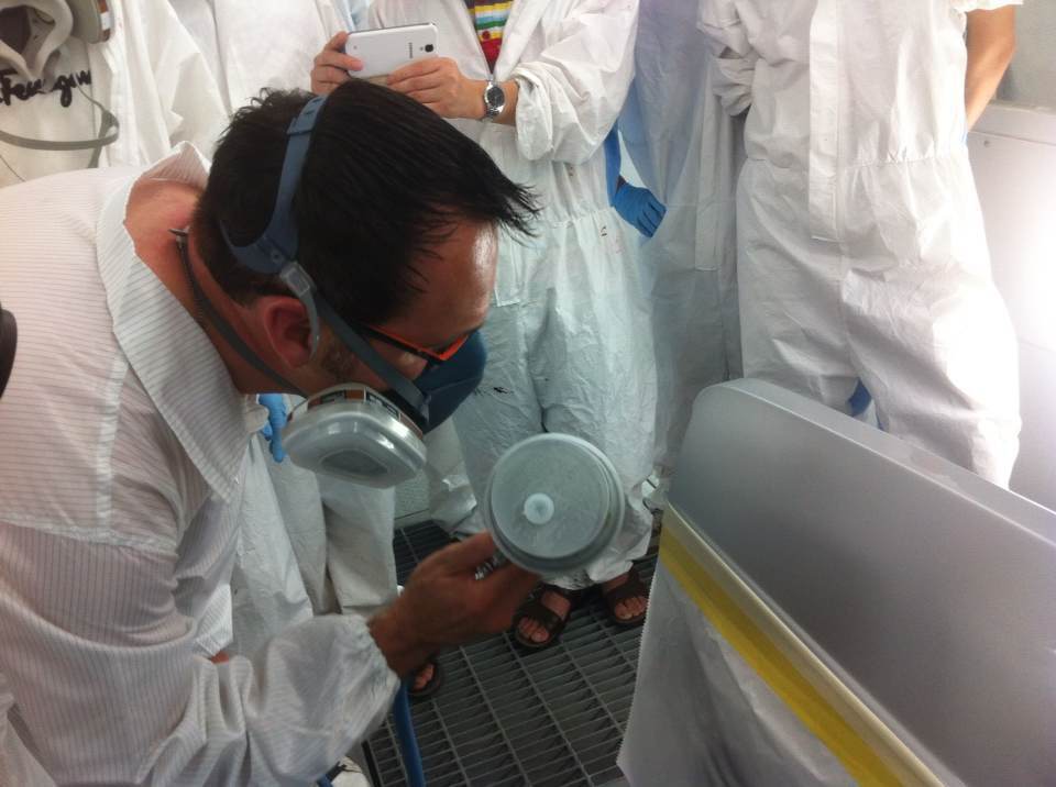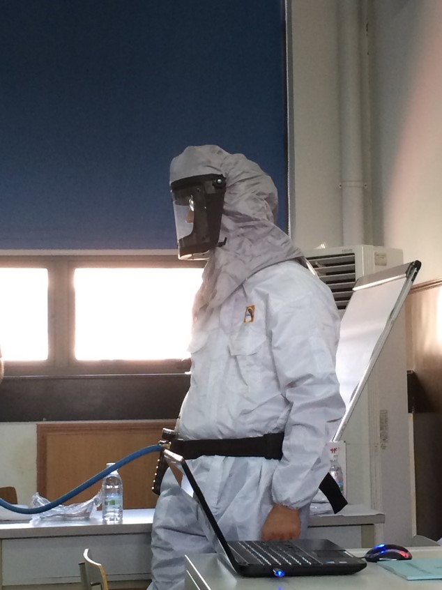 课堂上,Lenz老师在亲身示范SATA安全头盔的使用方法和清洁工序。